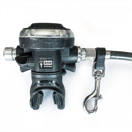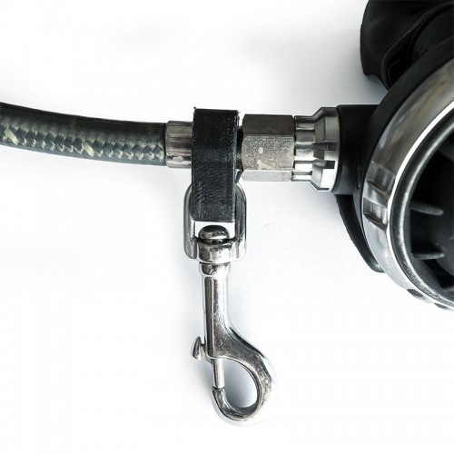 This newest design (Version 2 as called by Steve Bogaerts) comes with added improvements, that avoids gliding along the long hose when clipped off. This version comes with RAZOR branded stainless steel bolt snap, that is ready to be attached and ready for your Side Mount Diving! (Second Stage shown on image for illustration purpose only.)