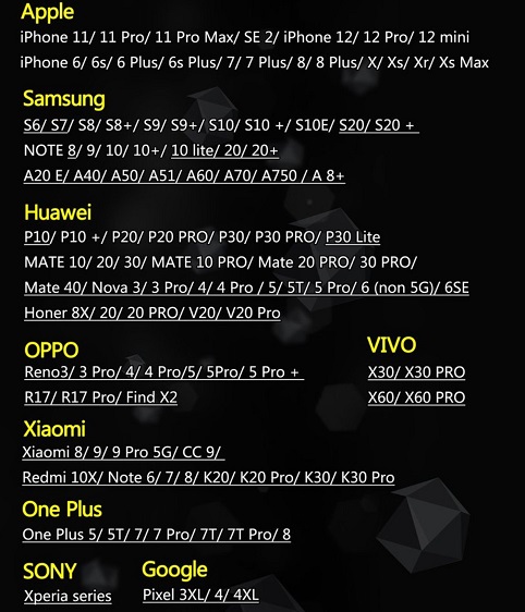 • 6/ 6s/ 6s Plus/ 7/ 7 Plus/ 8/ 8 Plus/ X/ Xs/ Xr/ Xs Max/ 11/ 11 Pro/ 11 Pro Max/ SE 2/ 12/ 12 Pro/ 12 Mini