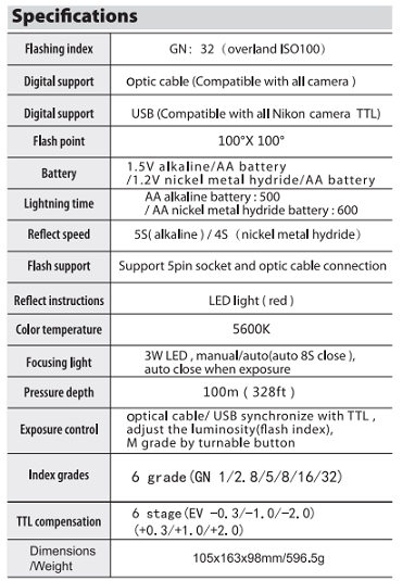 - Powerful G.N. 32 and UNDERWATER coverage 100x100 degree
