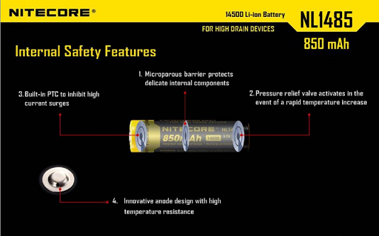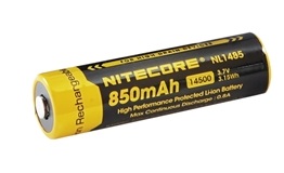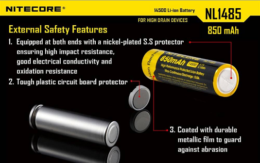 The Nitecore NL1485 is an 850mAh 14500 rechargeable button-top battery designed for use in high drain devices the NITECORE EA11 and other high performance flashlights and headlamps. This battery has advanced safety features a microporous barrier protecting internal components and nickel plated stainless steel protectors offering external protection. High performance internal circuitry prevents overcharge, over-discharge and short-circuiting to keep you and your devices safe.