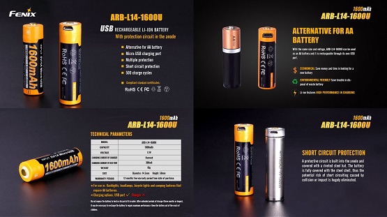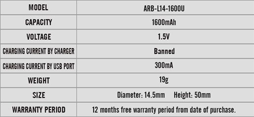 Part of Fenix's innovative new line of rechargeable batteries, the ARB-L14-1600U 14500 Battery is a potent combo of power and convenience. The powerful Lithium Ion battery delivers 1.5 Volts of power and can hold a considerable charge of 1600 mAh, more than twice the capacity of a typical 14500! Even more beneficial is the cell's unique micro-USB charging port, allowing the battery to be recharged using one of the most common power cords used today rather than a bulky, expensive battery charger. The charging progress of the battery can even be monitored thanks to the multicolored LED power indicator located on the top of the battery. Potent in its power and user-friendly in its design, the Fenix ARB-L14-1600U is the perfect cell for nay rechargeable battery user.
