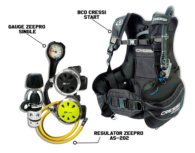 • The Start has two large accessory storage Pockets with Velcro closures, and the adjustable sternum straps along with both torso adjustment and waist straps are equipped with side release buckles for easy donning and doffing. The Waist Strap/Cummerbund Assembly is independently suspended from the Air Cell allowing the Air Cell to inflate away from the diver preventing the Squeeze-Effect when inflated. The backpack is rigid for support and stability of the cylinder, yet is fully padded for comfort. The Cressi Start BCD come with a 3/8" threaded Quick-Disconnect Low Pressure Hose and Owner's Manual.