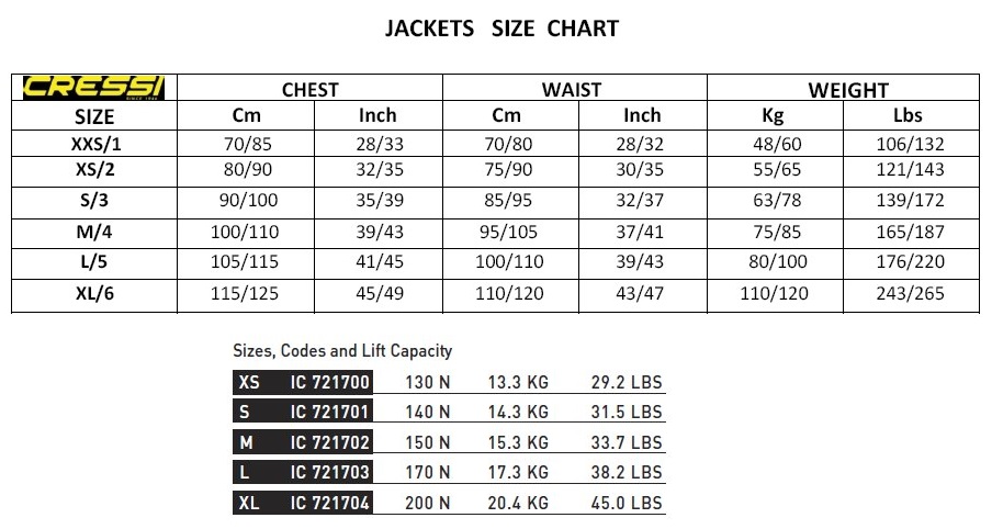 Buoyancy in Newton: 60 N (XS), 80 N 8S), 90 N (M),  130 N (L), 160 N (XL)