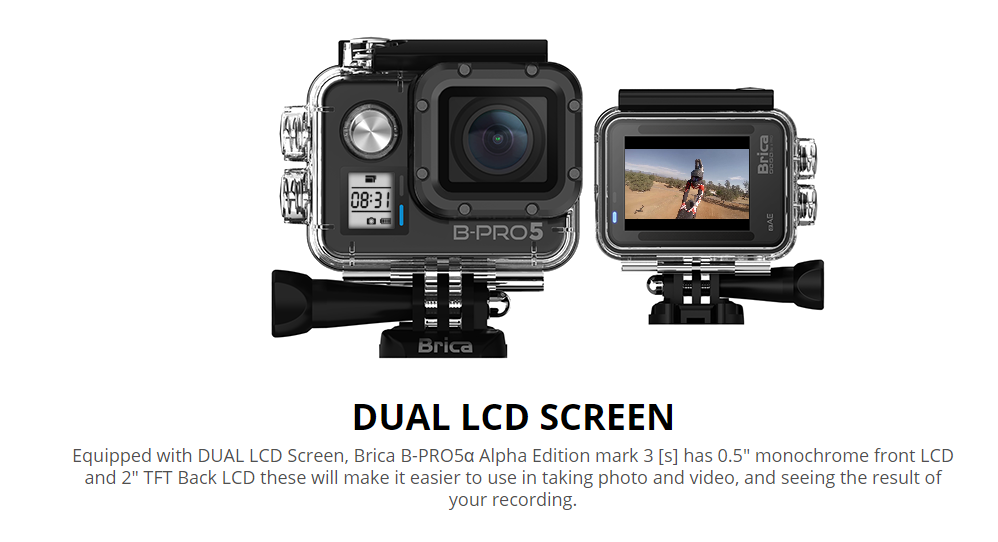 Equipped with DUAL LCD Screen, Brica B-PRO5α Alpha Edition mark 3 [s] has 0.5" monochrome front LCD and 2" TFT Back LCD these will make it easier to use in taking photo and video, and seeing the result of your recording.