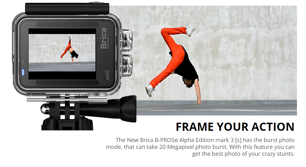 The New Brica B-PRO5α Alpha Edition mark 3 [s] has the burst photo mode, that can take 20 Megapixel photo burst. With this feature you can get the best photo of your crazy stunts.