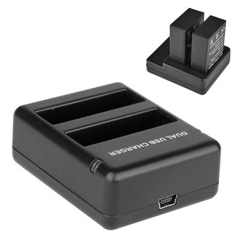 Charger baterai dengan 2 buah slot untuk mengisi baterai secara bersamaan. Digunakan untuk mengisi baterai GoPro Hero 4. Anda juga mendapat car charger agar dapat mengisi baterai GoPro saat perjalanan.