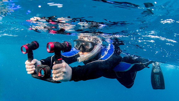 The Sea Dragon 2500 uses flat panel COB LED technology to closely mimic natural sunlight, bringing out amazing colors in underwater photos and videos. With a Color Rendering Index of 90, the Sea Dragon 2500 solves the issue of blue underwater photos and videos by giving divers the ability to add light down to 200 feet/60 meters with portable sunlight.