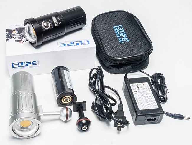 The V3K video light ships with a 1" ball mount, Charger, UK power lead, spare O-rings, and a handy carry case.
