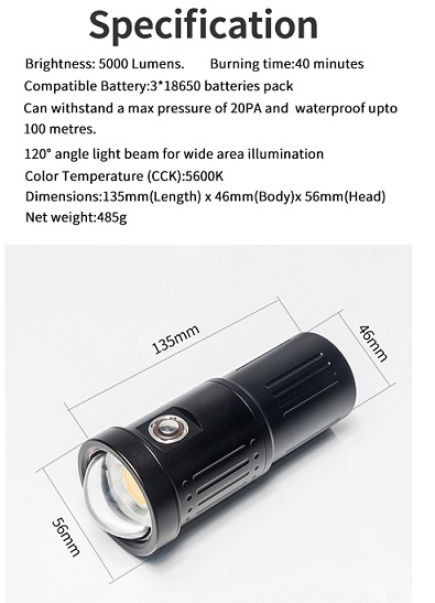 V3K - COB TORCH SCUBALAMP WIDE ANGLE 120' CRI96 5600K W/ CHARGER (5000 LUMENS)