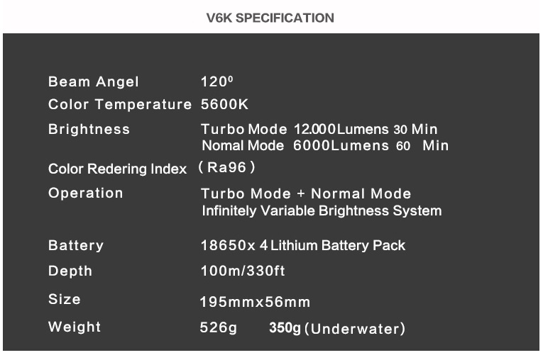 COB Torch V6K ScubaLamp Wide Angle 120' CRI96 (12000 Lumens)
