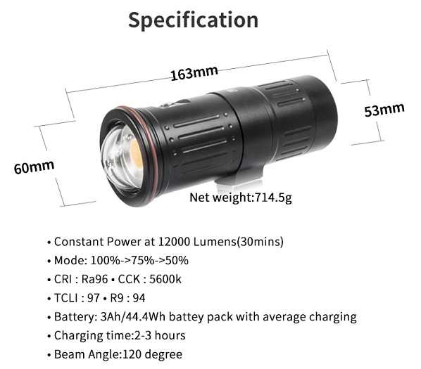 COB TORCH SCUBALAMP WIDE ANGLE 120' CRI96 W/ CHARGER (12000 LUMENS)