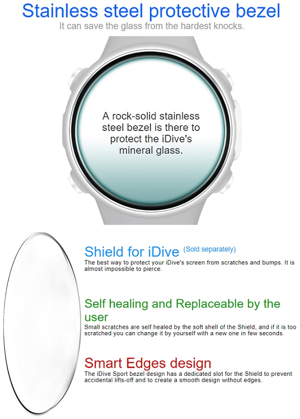 - Smart Edges design. The iDive Sport bezel design has a dedicated slot for the Shield to prevent accidental lifts-off and to create a smooth design without edges.