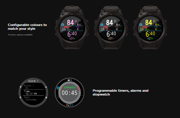 You can choose the colour scheme and layout of the screen both as a normal wrist watch for the surface and under the water.
