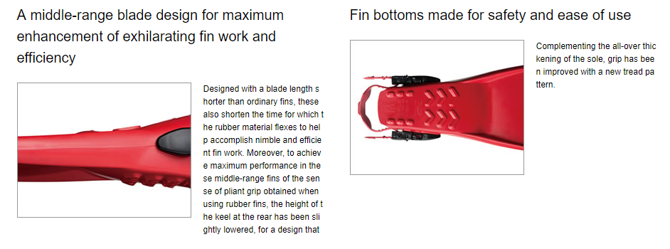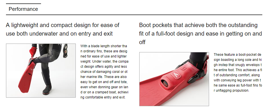 These feature aboot - pocket design boasting a long sole and high instep that snugly envelops the entire foot. This achieves a fit of outstanding comfort, along with conveying leg power with the same ease as full-foot fins for unflagging propulsion.
