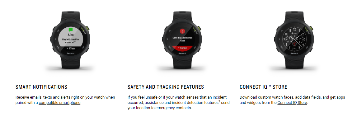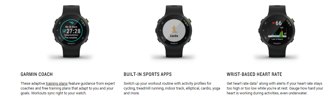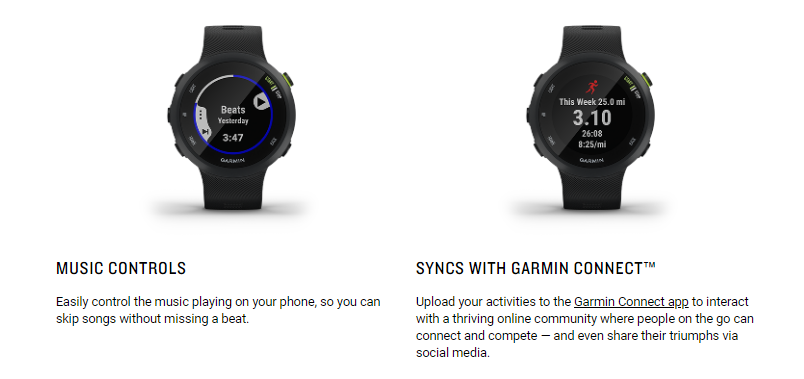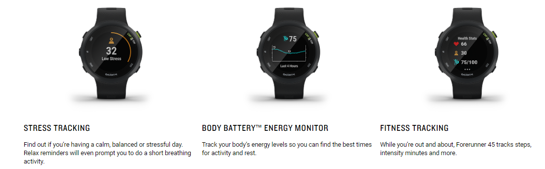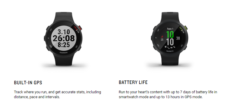 • Forerunner 45 is the GPS running watch with all the running-related features you need in a sleek, lightweight smartwatch you’ll want to wear all day and night.