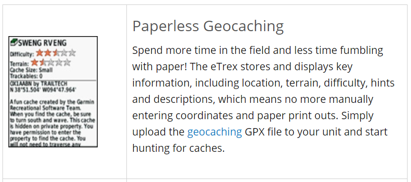 eTrex 30 supports geocaching GPX files for downloading geocaches and details straight to your unit. Visit Geocaching.com to start your geocaching adventure. By going paperless, you're not only helping the environment but also improving efficiency. eTrex 30 stores and displays key information, including location, terrain, difficulty, hints and descriptions, which means no more manually entering coordinates and paper printouts. Simply upload the GPX file to your unit and start hunting for caches.