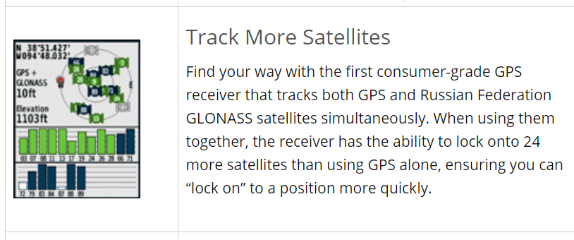 eTrex is the first-ever consumer-grade receiver that can track both GPS and GLONASS satellites simultaneously. GLONASS is a system developed by the Russian Federation that will be fully operational in 2012. When using GLONASS satellites, the time it takes for the receiver to “lock on” to a position is (on average) approximately 20 percent faster than using GPS. And when using both GPS and GLONASS, the receiver has the ability to lock on to 24 more satellites than using GPS alone.