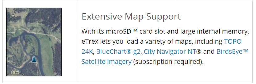 With its microSD™ card slot and 1.7 GB of internal memory, eTrex 30 lets you load TOPO 24K maps and hit the trail, plug in BlueChart® g2 preloaded cards for a great day on the water or City Navigator NT map data for turn-by-turn routing on roads (see maps tab for compatible maps). eTrex 30 also supports BirdsEye Satellite Imagery (subscription d), that lets you download satellite images to your device and integrate them with your maps.