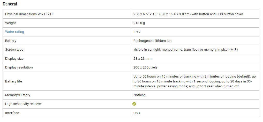 Strong, durable, impact resistant (MIL-STD-810F) and waterproof rated up to IPX7 , the inReach Mini is built to keep you flying and running. The device comes with a built-in lithium battery that can be charged for up to 50 hours of use in the default 10-minute tracking mode and up to 20 days in power-saving mode. Can be recharged with a microUSB power cord or 12-V in-vehicle charger.