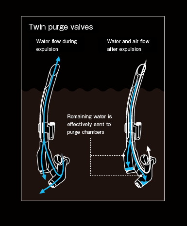 • Doubling the number of valves to two enables you clear much more water from the snorkel much more quickly. The design also effectively channels water that is not expelled away into drainage wells and away from your mouth. Now, you can actually enjoy coming up for air.