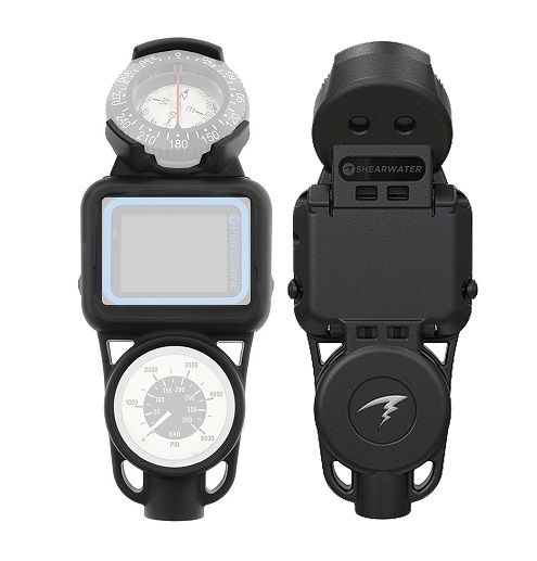 The PEREGRINE Console is a modular design that incorporates the Shearwater Peregrine dive computer, SPG, and compass in one component. This Console's modular options allow the user to customize a console to what they need.