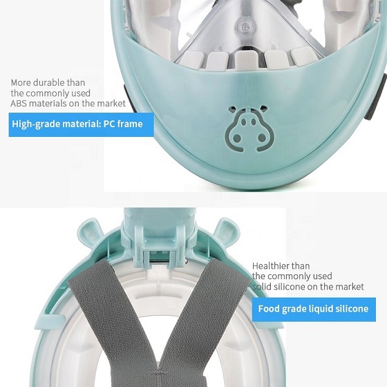 2. Professional anti-fog and anti-leakage design: independent inhalation and exhalation channels prevent the top breathing tube cover from fogging, and the anti-fog coating and anti-fog liner on the lens ensure the anti-fog effect; advanced anti-fog with float The leaky silicone sealing mask prevents saline from entering the mask.