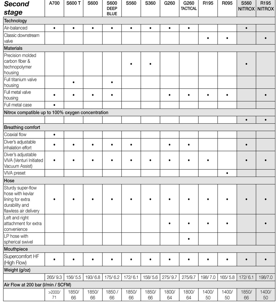 • SCUBAPRO diaphragm first stages feature balanced technology and are packed with patented features resulting in ultra fast flow to the second stage on demand and a fantastic overall performance.