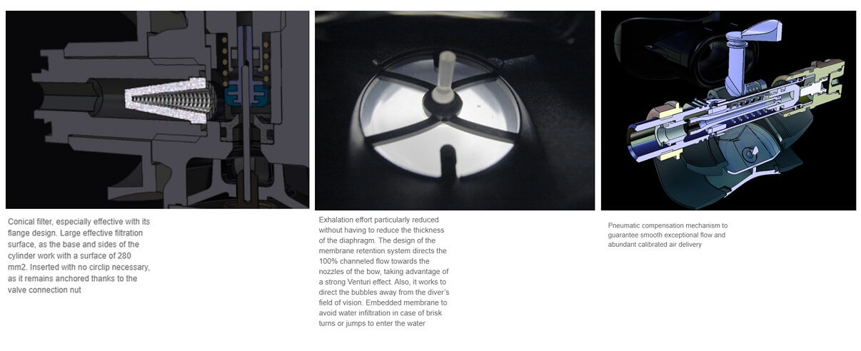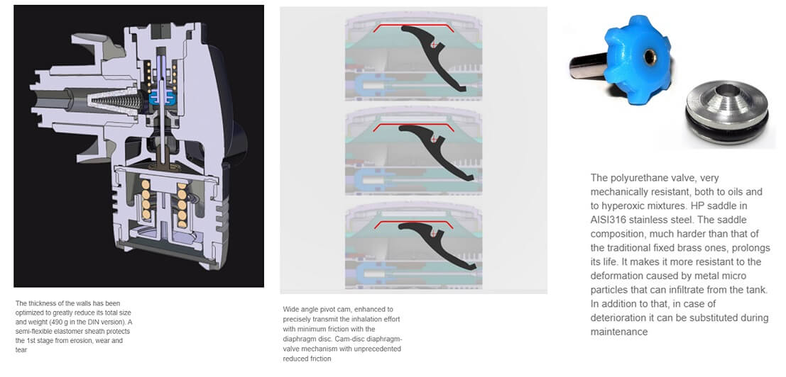 • Over-sized intake diaphragm for smoother breathing, the best of its kind: 2810 mm2, 12% more than the high range models offered by competitors. Contact plate with Teflon coated cam to reduce friction.