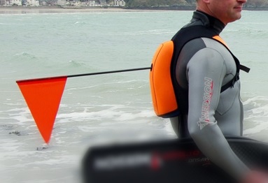 Unique one-fit neoprene harness jacket with incorporated water tight dry box and beacon flag for swimming in waters that has a lot of boat/Jet Ski or other water sports activity.