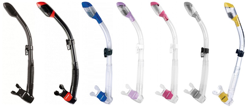 The Dry snorkel has a unique splash guard at the end which greatly reduces the entrance of water during use on the surface.