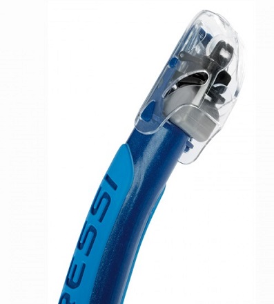Special snorkel with a special patented “Aquastop” valve at the top that keeps water out, making breathing easier and more natural. The tube has an expanded elliptical shape in order to increase comfort and air-delivery capacity. Purge valve near the mouthpiece. Distinguished from the Alpha Dry version by its anatomically curved shape.