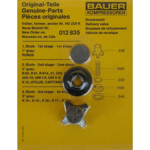 Bauer discharge valve kit 012835 contains the essential wear items in the valve assembly. Use the chart below to see the proper application of this discharge valve kit.
