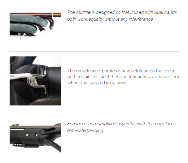 • New integrated rubber load assist. Shaft coupling point 5 cm back to optimize the bands’ dynamic propulsion and to prolong it for the longer barrel. Enhanced and simplified assembly with the barrel to eliminate bending.