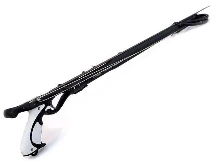 Anticorodal brown camouflaged frame improved with integrated spear guide and lower anti-bending reinforcement, handle has sternal support with a soft interchangeable high-low position. Release box made entirely of stainless steel with lateral guide line release having automatic return and buckling tooth stroke damper. Tilting lateral safety catch. Reinforced reel buckle with steel through pin. Head for double elastic with magnetic spear lock: as soon as the spear is put in place, it is held by two neodymium magnets mounted in a watertight chamber. This characteristic guarantees maximum speed of reset without the disadvantages of conventional mechanical restraint systems. Supplied assembled and ready for use, multifilament braided nylon and 6.5 mm spear with small 17-4 ph steel fins.