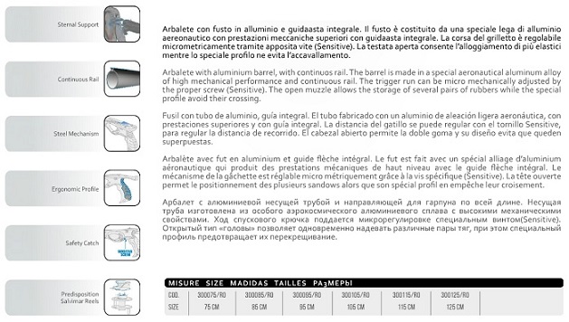 The Salvimar Voodoo Rail Spear Gun has an aluminum barrel, with continuous rail for extreme accuracy when hunting that trophy fish. The barrel is made by a special aeronautical aluminum alloy of high mechanical performance. The spear guns trigger run can be micro mechanically adjusted by the proper screw (Sensitive). The open muzzle allows the use of several pairs of rubber bands while the special profile prevents overriding of bands. The guns muzzle has a removable bridge.