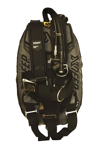 The single tank adaptor and wing can be lowered down the spine of the back plate for custom trim in the water. The shape of the bladder is a modified donut shape with more buoyancy in the small of your back for a horizontal position in the water and an upright position on the surface.