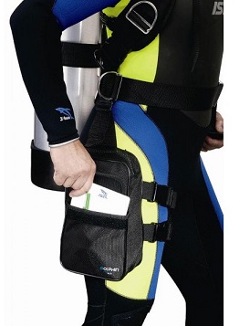 Provides roomy and streamlined storage for spare / back-up equipment and an internal D-ring serving as attachment point for dive reel etc. Additional front writing slate pocket.  2” (5cm) webbing and WK-4 keeper form a length adjustable loop which the waist strap can be threaded through.