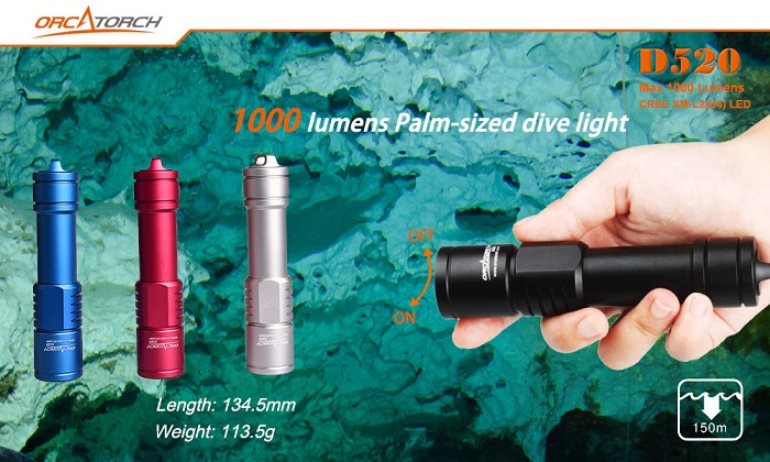 The Blue Reef Orca Torch D520 is a palm-sized diving light with a mechanically rotary switch. The rotary switch offers high reliability underwater. Using the USA CREE XM-L2 (U4) neutral white LED, its maximum output can reach 1000 lumens, meanwhile the 5000K LED color temperature provides superb color rendition. Powered by one 18650 battery, its maximum runtime can reach 2 hours. Plus robust water pressure resistant construction, high portability and easy operation, D520 would be qualified for both recreational diving as a primary light and deep diving as a backup light.