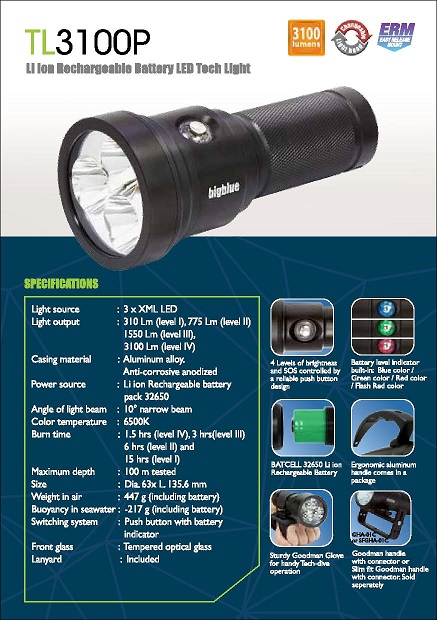 The TL3100P also comes with a reinforced Goodman-style glove, and an aluminum lantern-style handle, which makes this light a versatile option for any diver.
