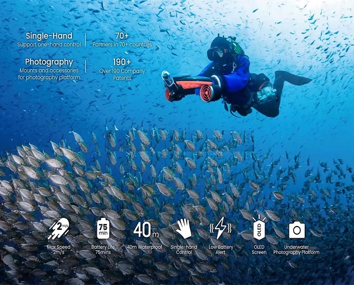 Seabow/Navbow, the most powerful underwater scooter! 3 speeds up to 2m/s, 40m depth, max 75 mins battery life and extendable to underwater photography platform.
