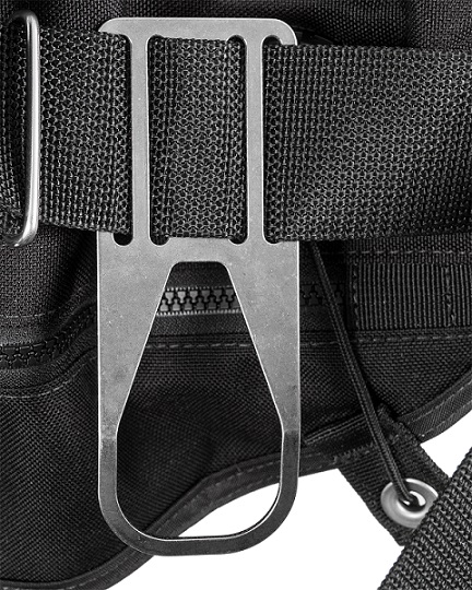 The titanium drop D-rings are designed to provide additional accessory clip points to the back of a sidemount harness. They are installed by simply weaving the waist webbing strap through the four vertical slots.