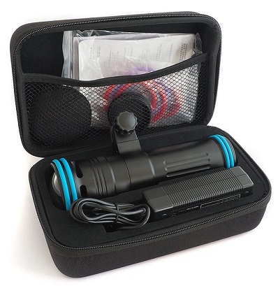 8000 lumen maximum power of the Solar Flare 8000 is sure to be enough in every underwater video situation. This surprisingly small unit produces a beautiful 5000K colour temperature beam with a burn time of 65 minutes. The light unit comes fitted with dome lens that suppresses the magnification effects of water and retains the 120-degree super wide-angle beam even when submerged.