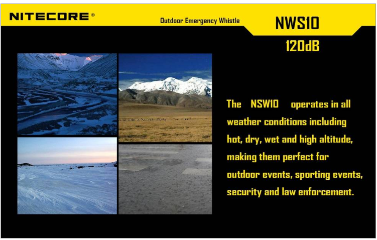 NiteCore NWS10 is the loudest emergency whistle on the market. You can effortlessly produce 120 decibel sound. Made of titanium alloy, NWS10 is durable, lightweight and compact. You can put on your keychain or hang around the neck. Ideal for boating, scuba diving, hikers and personal safety. Widely used by Security, Military, Police, and crime prevention units.