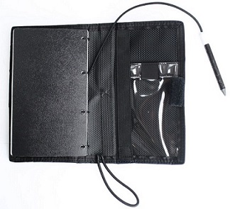 • has a heavy duty nylon fabric cover that is closed using a Velcro tab and elastic cord that is stretched across the notebook.